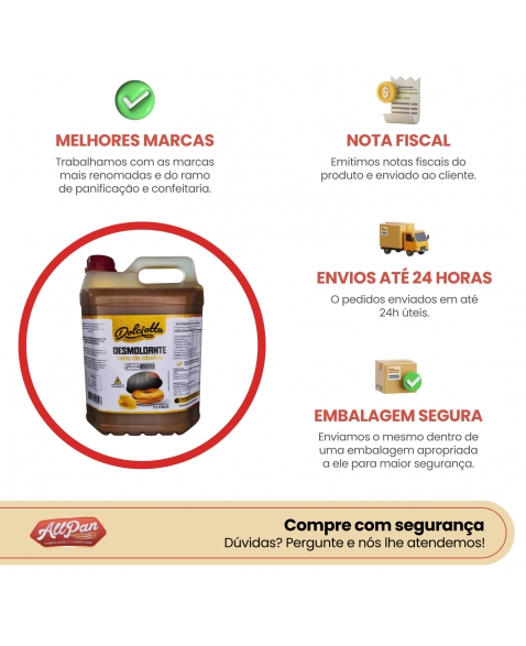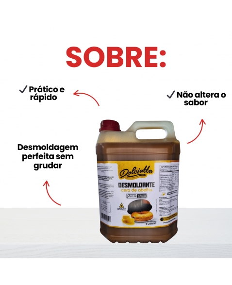O Desmoldante Cera de Abelha Dolciatta 5 Litros é a solução prática e econômica para facilitar o processo de desenformar bolos, tortas, pães e outras receitas. Sua fórmula exclusiva à base de cera de abelha garante desenforme perfeito, preservando o formato dos preparos e evitando desperdícios.
