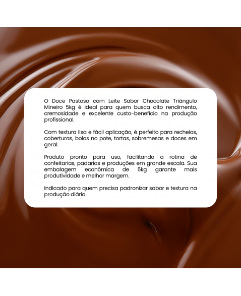 O delicioso doce pastoso com leite da Triângulo Mineiro adicionado de chocolate para deixar as suas receitas ainda mais saborosas. O balde com 5kg é ideal para o mercado de food service levando mais economia para os estabelecimentos.