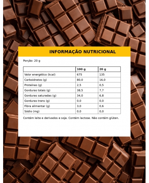Ingredientes: Açúcar, gordura vegetal modificada (estabilizante: triestearato de sorbitana), cacau em pó, leite em pó desnatado, massa de cacau, emulsificantes: lecitina de soja e ésteres de ácido ricinoléico interesterificado com poliglicerol e aromatizante. NÃO CONTÉM GLÚTEN. ALÉRGICOS: Contém leite e derivados de soja.