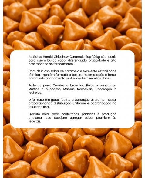 As Gotas Harald Chipshow 1,01kg Caramelo Top foram desenvolvidas para trazer ainda mais sabor, qualidade e praticidade às suas receitas. Com sabor irresistível de caramelo, elas são perfeitas para incrementar cookies, bolos, pães, brownies e diversas sobremesas.