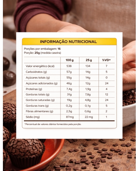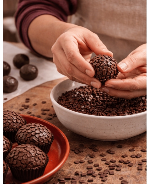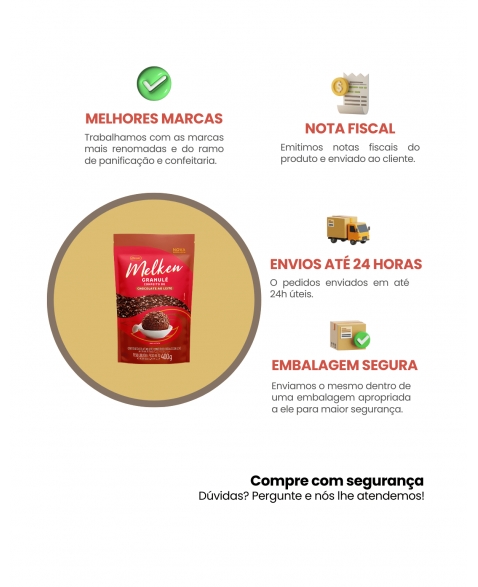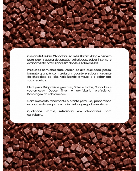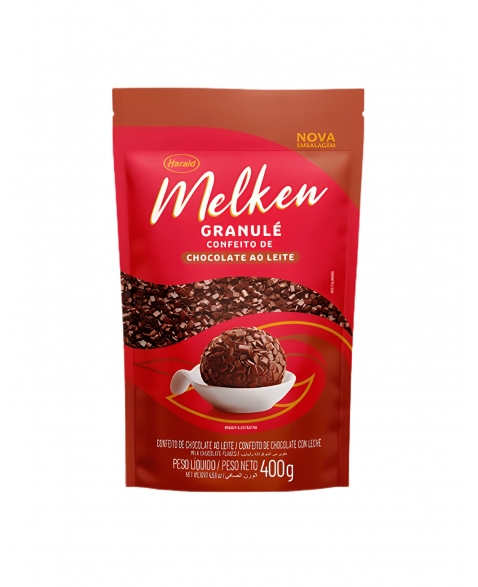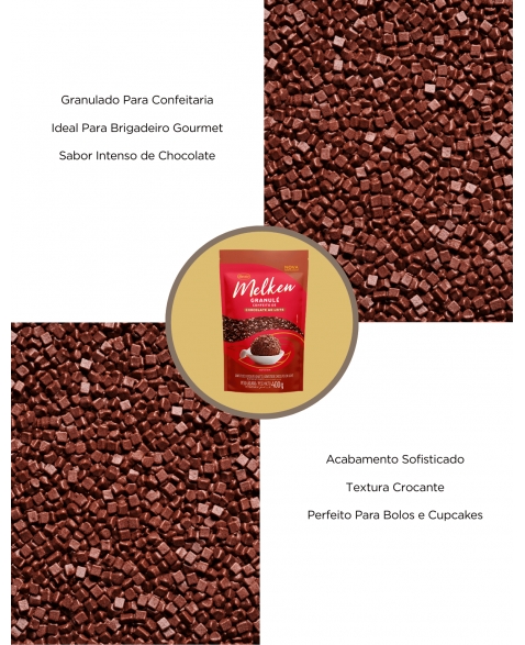 Produzido com o chocolate nobre, o Granulé Melken é um acabamento gourmet que finaliza e decora com elegância, sendo ideal para cobrir docinhos moldados, brigadeiros, doces de colher.