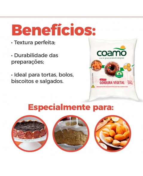 A Gordura Vegetal da Coamo é ideal para dar textura e volume e realçar o sabor das massas de pães, bolos e confeitaria em geral, com alta qualidade e versatilidade deixa seus produtos mais leves e fofinhos