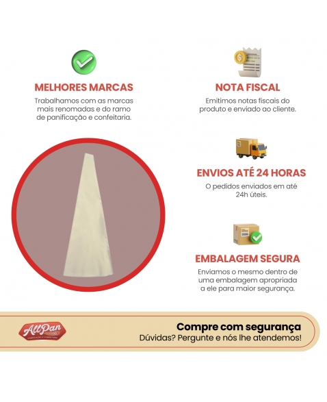 A Allpan oferece uma garantia de 90 dias contra defeitos de fabricação, proporcionando segurança e confiança em sua compra. Somos uma distribuidora especializada nos ramos de panificação, confeitaria, sorveteria e chocolateria, com mais de 15 anos de história e atendendo mais de 2 mil clientes em 180 cidades do nordeste paulista e sul de Minas Gerais.